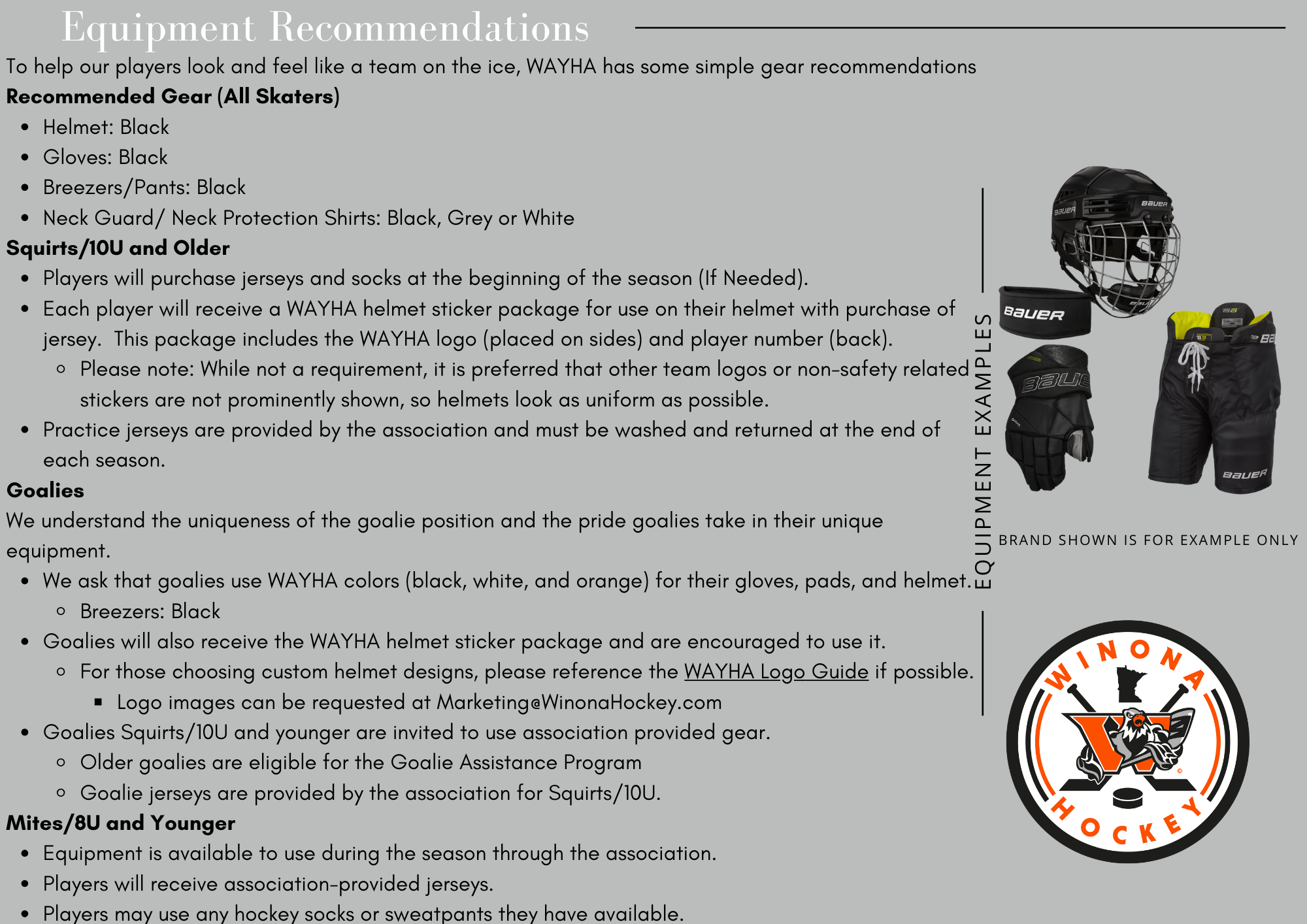 WAYHA can provide all necessary equipment for new and younger players and goalies. This is a great service to help kids and families fall in love with the sport of hockey. Contact Ben Gordon - Equipment, Jersey, and Apparel Manager with any questions.